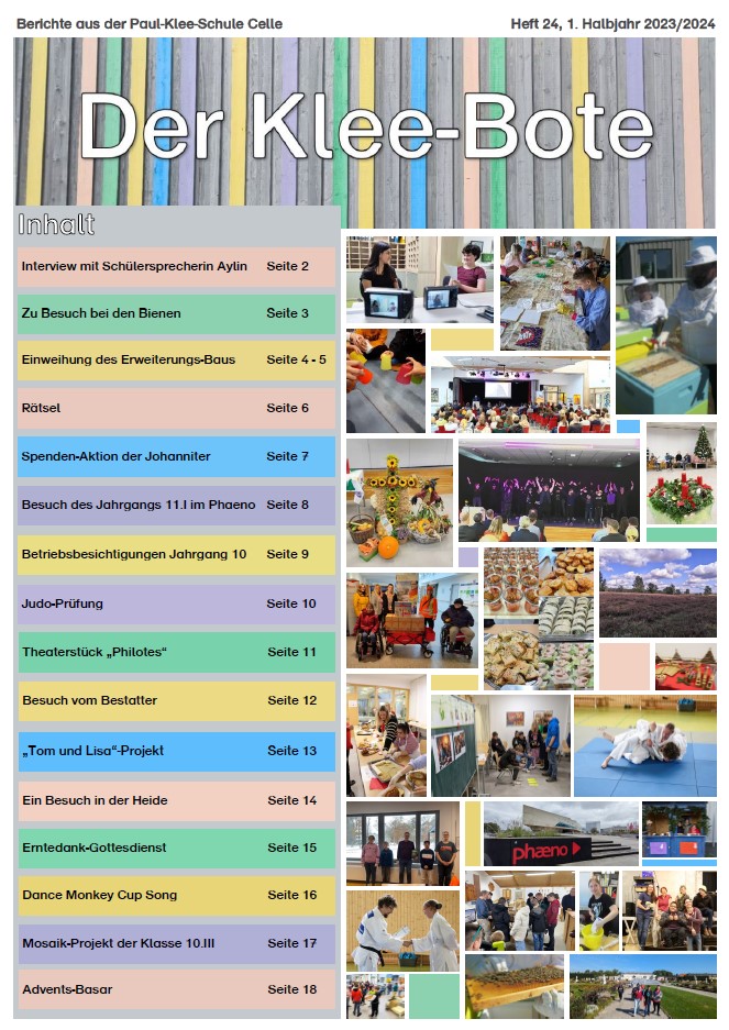 die 24. Ausgabe unserer Schulzeitung ist nun erschienen, an der die Schülerinnen und Schüler der Redaktion des Klee-Boten mit Frau Moasa und Herrn Ahrens sehr engagiert gearbeitet haben.